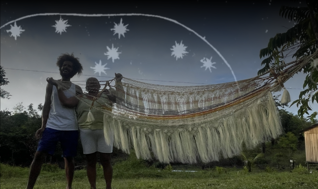 Les spectateur·ices sont invité·es à s’allonger sur des hamacs et des nattes, et à contempler la transformation de l’espace et du temps à travers les enseignements des étoiles. La production de l’œuvre est une réalisation de l’Escola Viva Baniwa, un collectif éducatif et culturel de la communauté autochtone d’Assunção do Içana qui se consacre au renforcement des connaissances ancestrales du peuple Baniwa et qui s’est engagée dans les enregistrements audiovisuels, musicaux et narratifs présentés dans l’installation.